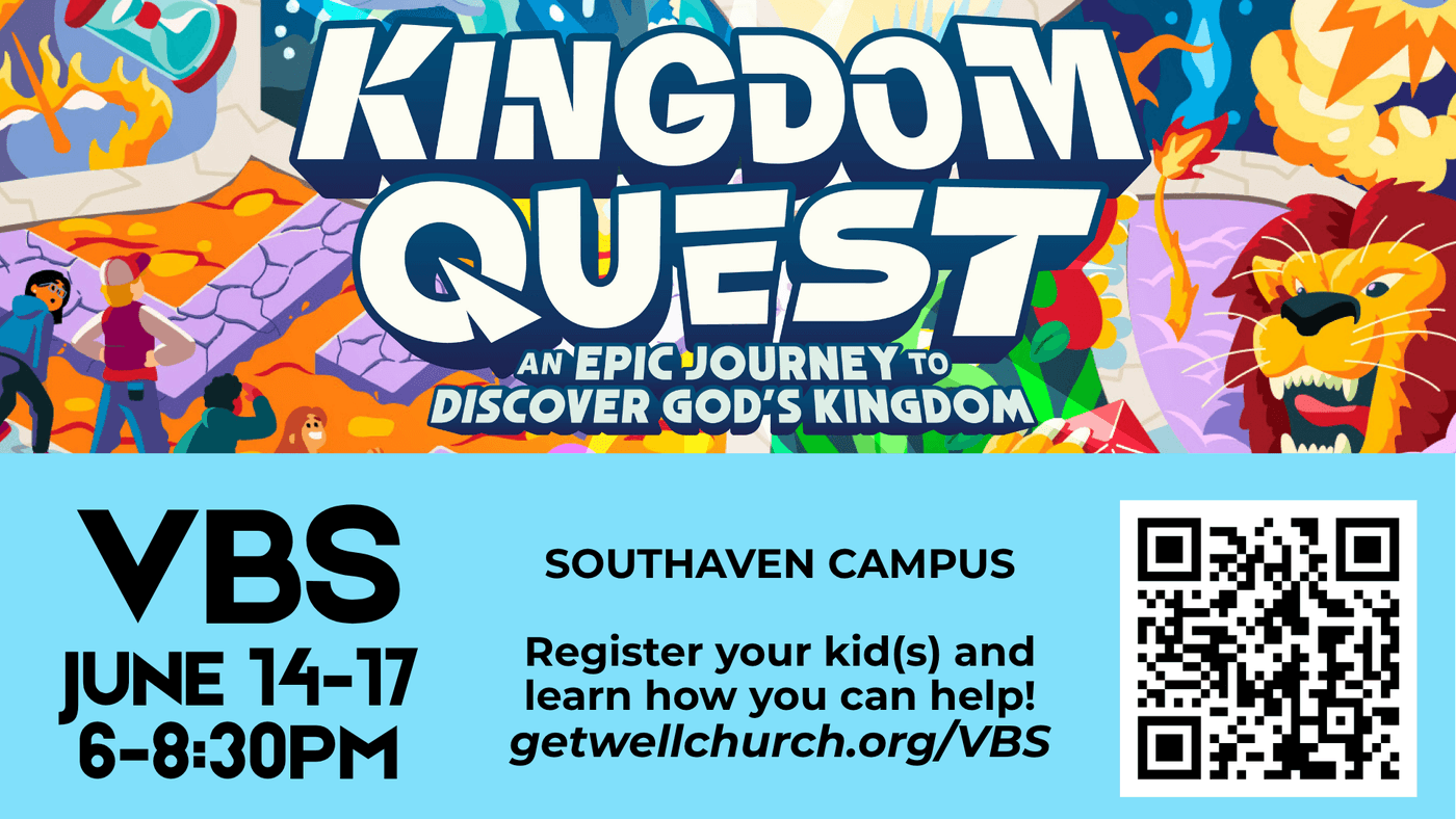 VBS 2026 on the Southaven campus is set for June 14-17! Go ahead and click below to register your kids to attend and check out options to serve. There are SO many ways that you can help... there's a role that's perfect for you! To learn more, visit getwellchurch.org/VBS.